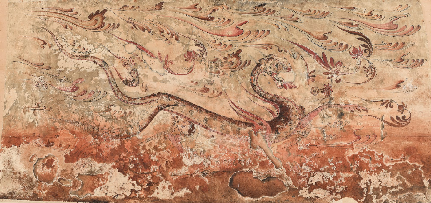 또한 백호 배경의 오색五色의 구름 속에 꽃송이가 흩날리는 신비로운 장면은 상서로운 기운에서 생명체가 화생하는 것처럼 묘사했습니다. 백호의 표현이 매우 세련되고 유려하며, 배경에 빠르게 흐르는 기운과 흩날리는 꽃의 표현 형식을 통해볼 때, 이 고분은 6세기 전반에 조성된 것으로 추정됩니다.