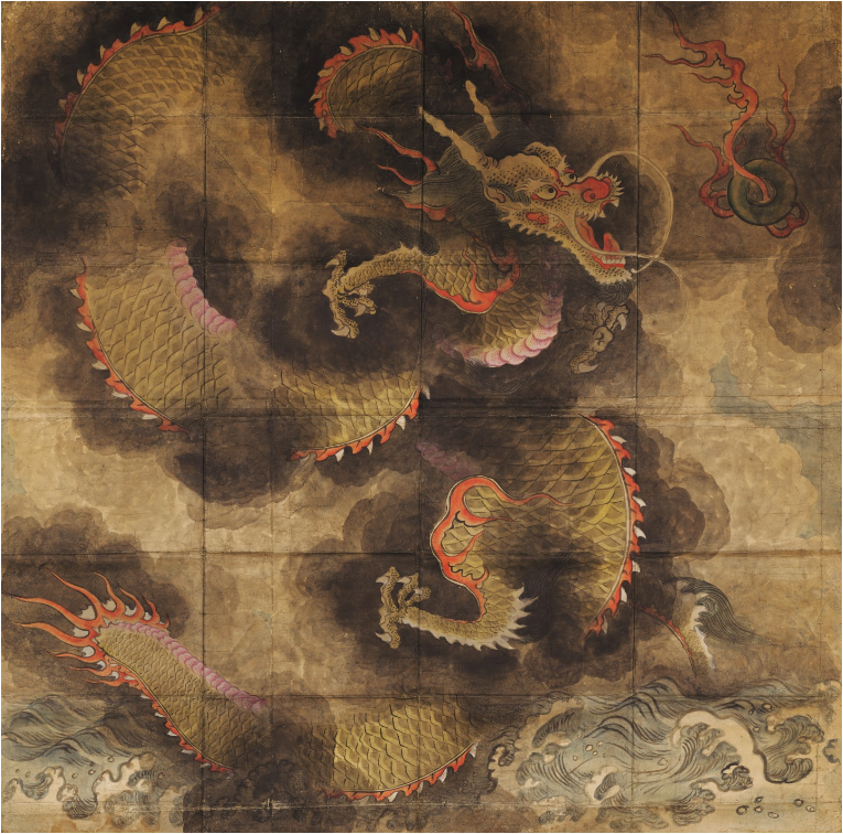 용은 비와 구름을 가져오는 전설속의 동물로, 용 그림은 초자연적이고 강력한 신통력을 가지고 있다고 믿어져 세화歲畫의 소재로 사랑받았습니다. 그림 속의 용은 먹구름을 뚫고 용트림을 하며 하늘로 오르는 모습인데, 사람의 얼굴을 닮은 용의 호탕한 표정이나, 묵중하고도 사실적인 먹구름의 표현, 그리고 웅장한 구성에서는 조선시대의 여느 용 그림과도 구분되는 격조와 솜씨가 느껴집니다.