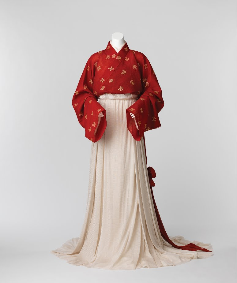 고려 복식 1 관경변상도(觀經變相圖)에 표현된 고려 여인의 우아한 모습을 재현하기 위해 특별히 제직한 소재를 사용했다. 실크사로 라직물을 재현한 소재를 이용하여 저고리와 치마의 부드러운 실루엣을 연출했다. 홍색으로 염색한 저고리 위에는 순금으로 구름 문양을 박(箔)하여 화려하던 고려 복식을 표현했다.