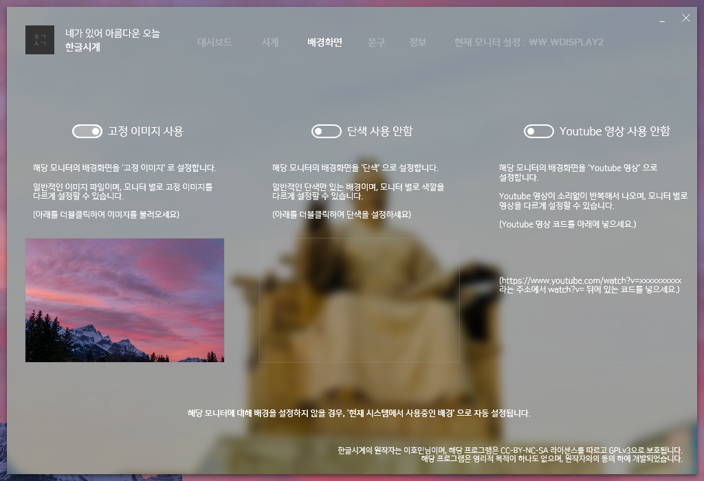 저처럼 고정이미지를 설정하여 바탕화면에 배경사진을 넣어 감성적인 한글시계를 만들 수 있습니다. 최대한 깔끔한 것이 좋으신 분들은 단색 컬러를 설정할 수 있습니다. 아래의 박스 칸을 더블클릭하세요. 조금 더 입체적인 영상을 출력하고 싶으신 분들은 유튜브 영상 코드를 넣어서 바탕화면에 유튜브 영상을 재생시킬 수도 있습니다.