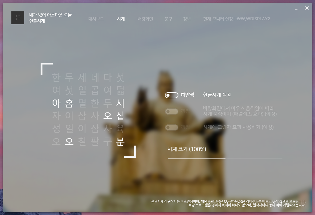 한글시계 사용중 토글을 클릭하여 한글시계를 활성화 시켜줘야합니다. 만약, 듀얼모니터라면 현재 모니터 설정을 변경한 후에 한글시계 토글을 활성화 시키시면 됩니다. 반대로 한글시계 적용을 해제하고 싶다면 토글을 다시 한번 클릭해주면 됩니다.