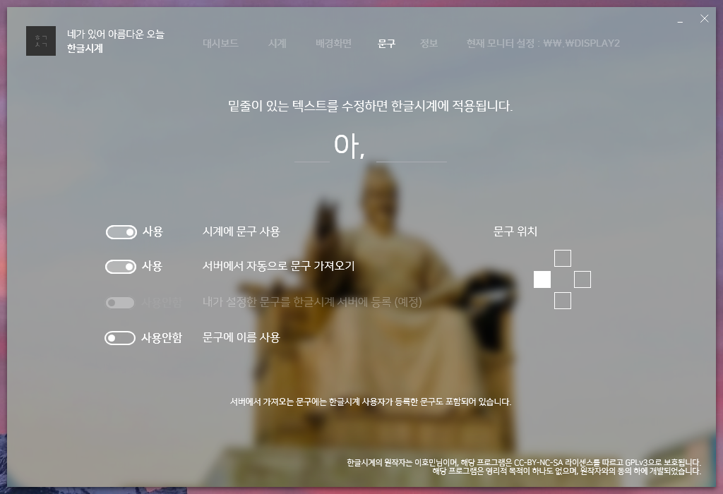 한글시계는 시계에 문구를 사용할 수 있으며, 서버에서 자동으로 문구를 가져올 수 있습니다. 또한, 문구에 이름도 사용할 수 있으며, 더욱 애틋하고 개인적인 한글 시계로 사용할 수 있습니다. 문구 위치도 다양하게 설정할 수 있습니다. 만약 문구가 조금 짤린다면 맨 처음 탭으로 이동하여 시계의 크기를 조절하여 딱 맞는 사이즈로 한글시계를 볼 수 있을 겁니다.