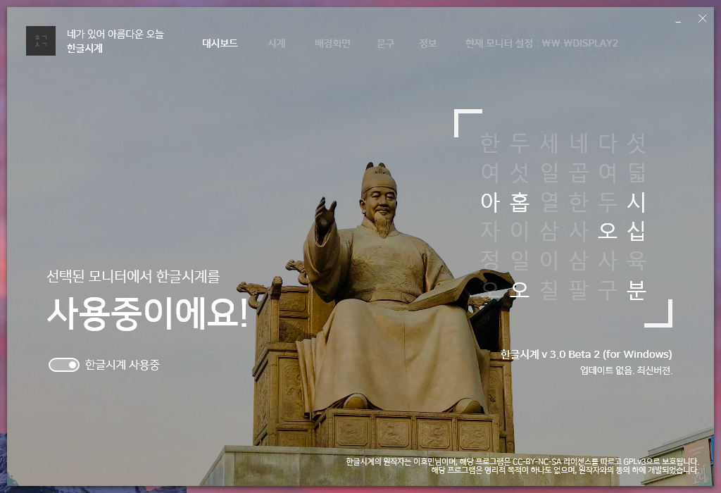 한글시계 사용중 토글을 클릭하여 한글시계를 활성화 시켜줘야합니다. 만약, 듀얼모니터라면 현재 모니터 설정을 변경한 후에 한글시계 토글을 활성화 시키시면 됩니다. 반대로 한글시계 적용을 해제하고 싶다면 토글을 다시 한번 클릭해주면 됩니다.