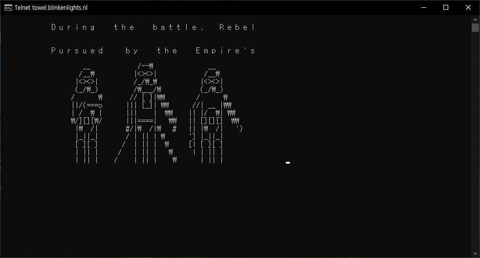 윈도우에서 스타워즈를 감상할 수 있다고 하면 믿을 수 있는가? 그것도 텍스트로 이뤄진 스타워즈 4를 말이다. 이 재밌는 기능은 이미 꽤 유명해져 알 사람들은 알지만, 이러한 기능이 있는지도 모르는 사람들이 많다. 윈도우의 CMD(도스 창)에서 텔넷 기능을 활성화하면 텔넷으로 접속이 가능하다.