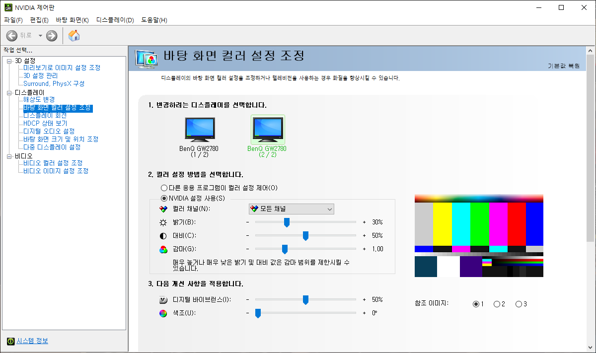 여러 부분을 조절할 수 있는데, 저는 이번에 밝기만 조절하려고 합니다. NVIDIA 설정 사용을 체크하고, 채널에서 밝기(B)를 조절해주시면 됩니다. 약 30% 정도로 낮추면 눈의 피로를 상당히 줄일 수 있습니다. 마찬가지로 감마도 조절할 수 있습니다. 듀얼 모니터의 경우에는 채널을 디스플레이 채널을 선택해서 한쪽만 또는 양쪽 모두 조절할 수 있습니다.