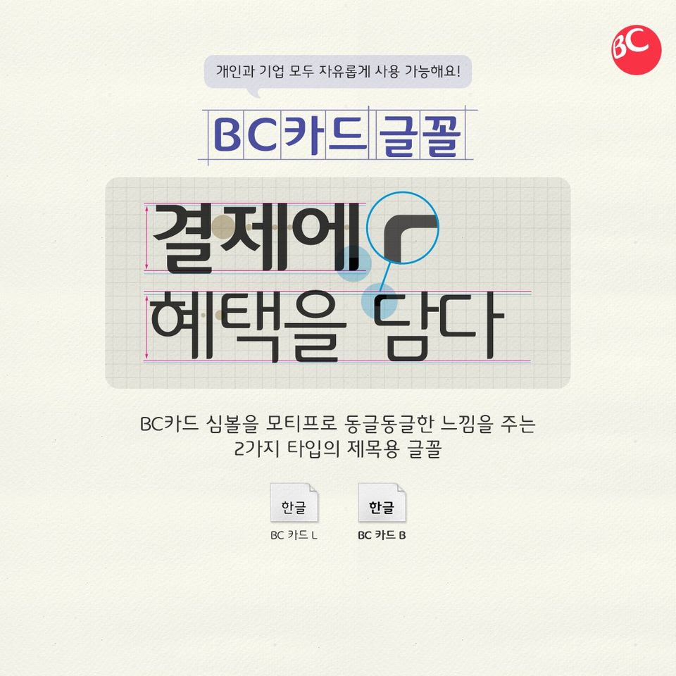 BC카드 심볼을 모티프로 동글동글한 느낌을 주는 제목용 글꼴로 2가지 타입입니다.