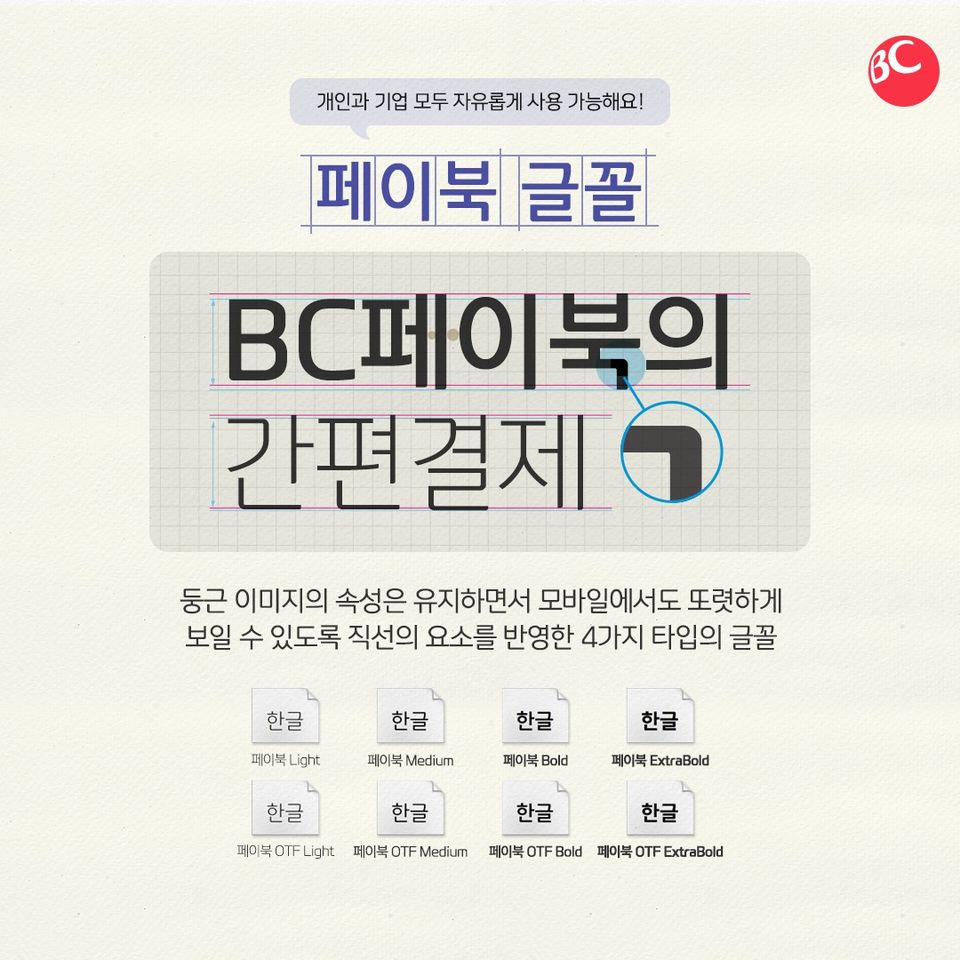 - BC카드 글꼴과 페이북 글꼴은 개인 및 기업 사용자를 포함한 모든 사용자에게 무료로 제공되며 상업적 목적으로