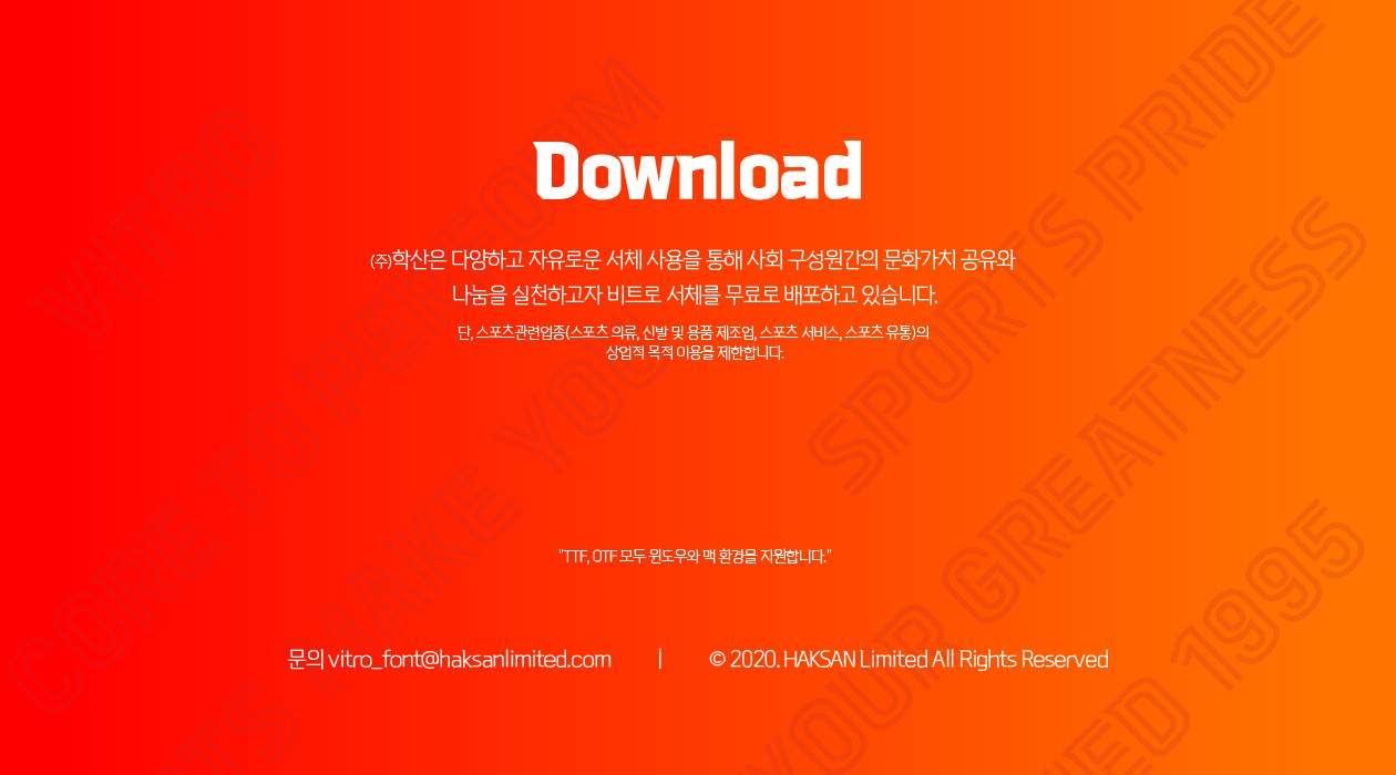 스포츠 전문기업 ㈜학산이 한글날을 맞아 자체 개발한 서체(사진)를 무료로 배포했습니다. 비트로는 ㈜학산의 스포츠 브랜드입니다. 574돌 한글날을 기념해 자체 브랜드 ‘비트로’ 이름으로 제작한 서체 ‘비트로 코어’와 ‘비트로 프라이드’ 2종을 소개합니다.