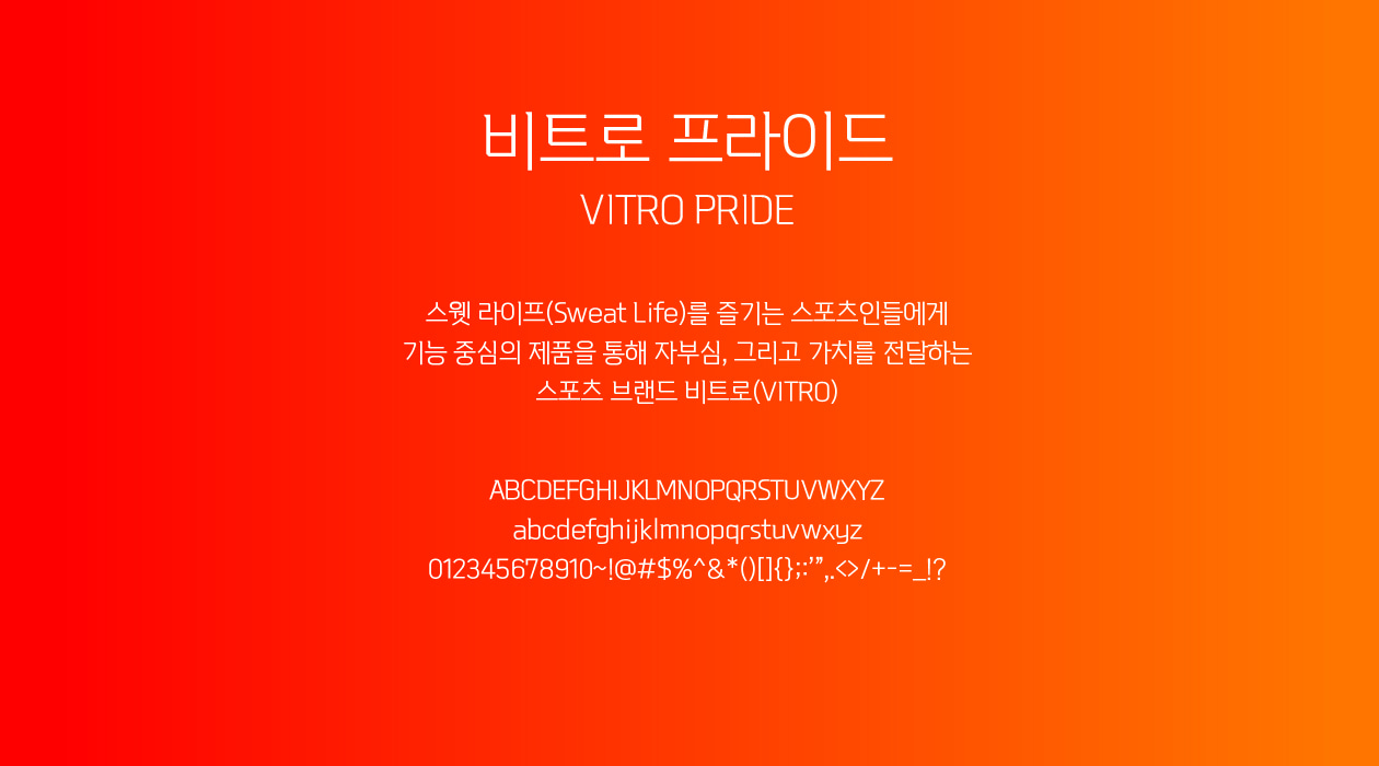힘 있고 강한 서체를 구현한 ‘비트로 코어’는 주목성이 필요한 타이틀에, 안정적인 ‘비트로 프라이드’는 가독성이 필요한 본문에 어울립니다. 타이틀과 본문용으로 사용할 수 있습니다. 두 개 서체 모두 가로·세로 획 굵기가 일정한 비율로 안정적인 느낌을 주고, 고딕체이지만 모음에 부리가 있어 유니크한 스타일을 느낄 수 있으며, 속도감과 역동성을 서체에서 느껴지는 매력있는 서체입니다.