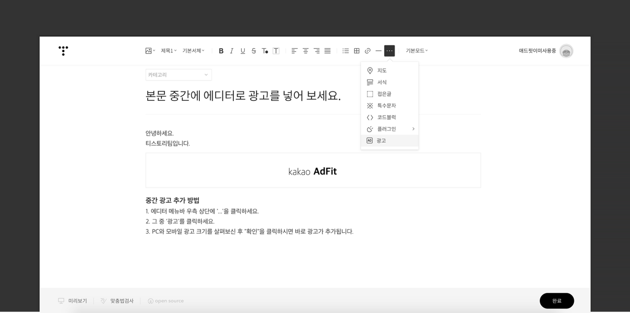 - 3. 에디터에서도 본문 중간에 광고를 추가할 수 있도록 준비했습니다.