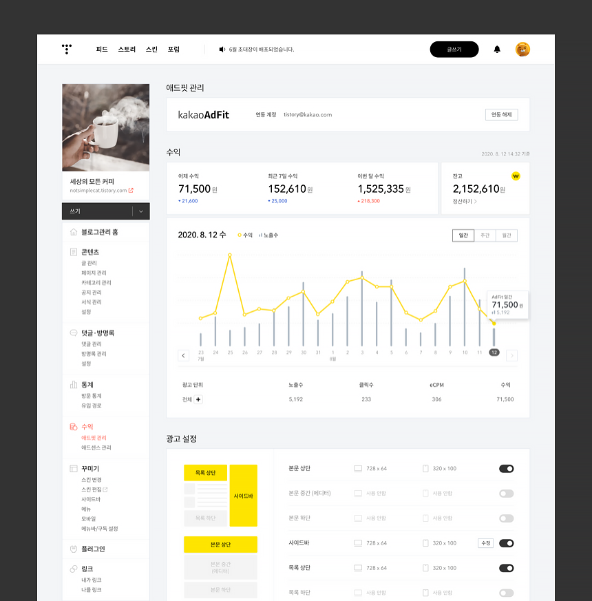 2020년 10월 내에 선보일 수 있도록 열심히 준비 중입니다. 손 쉬운 광고 설정 및 수익 확인, 기다리셨던 'ads.txt 문제 해결'까지 되는 새 관리 기능 '수익'! 조금만 기다려 주세요. 감사합니다.