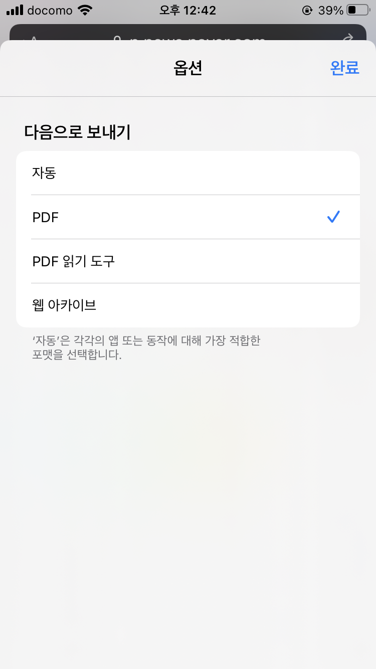 그러면 위와 같은 상태바가 뜹니다. 위의 옵션을 클릭해서 다음으로 보내기 설정을 PDF로 변경해줍니다. PDF로 보내지지 않을 때 설정하는 옵션창입니다. 그 다음에는 이 화면을 여러 방식으로 PDF를 보낼 수 있습니다. 파일로 저장하거나 iCloud Drive로 보내거나 카카오톡으로도 쉽게 보낼 수 있습니다.