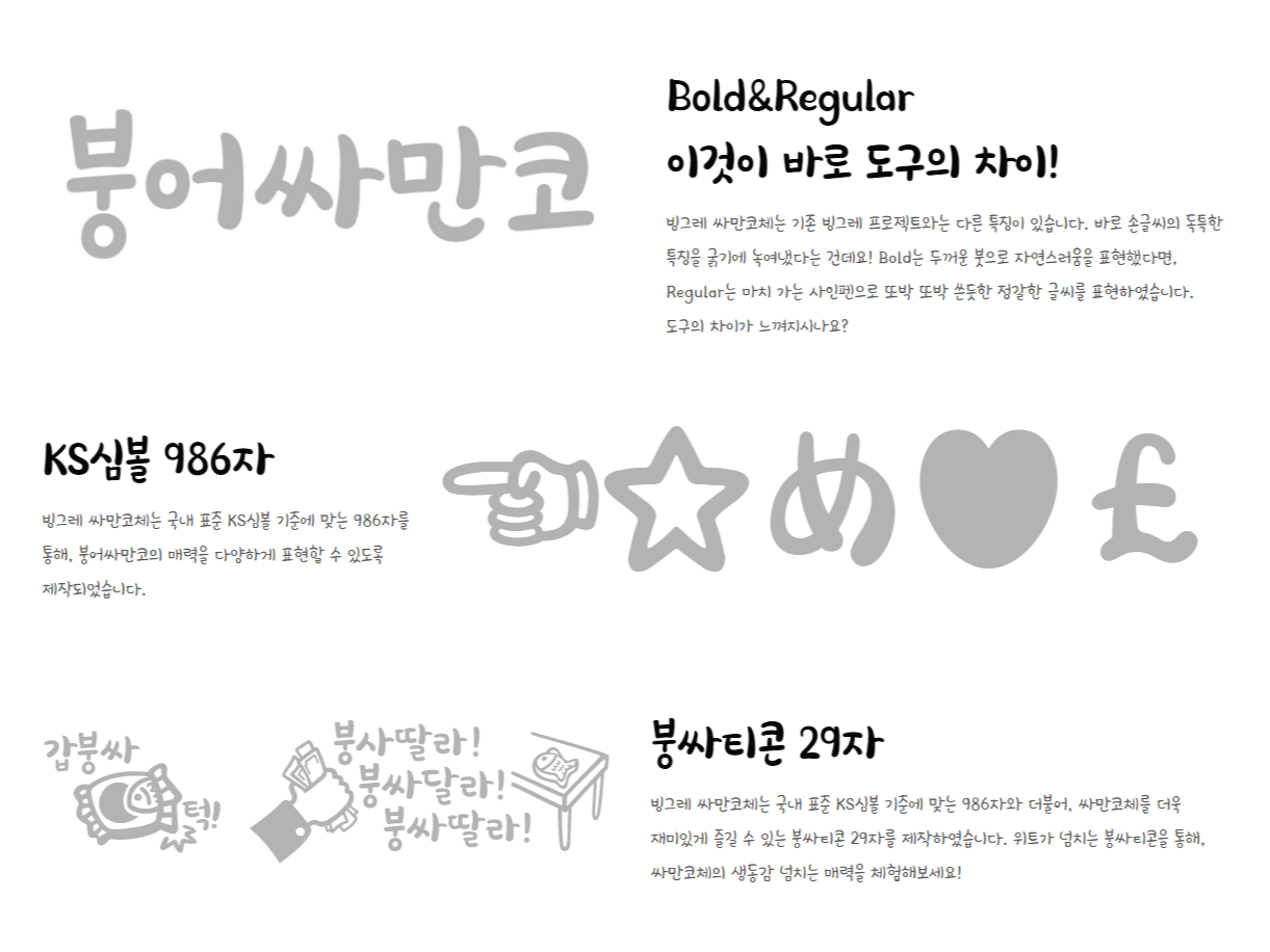 - 빙그레 서체는 개인 및 기업 사용자를 포함한 모든 사용자에게 무료로 제공합니다.