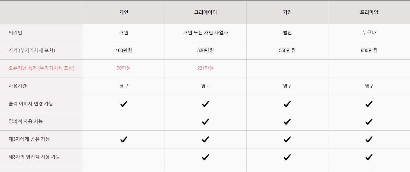 - 개인 플랜의 경우 영리 목적의 폰트 사용이 불가능합니다. 영리적 사용을 희망하시는 경우, 크리에이터, 기업, 프리미엄 플랜 중에서 선택해주세요.