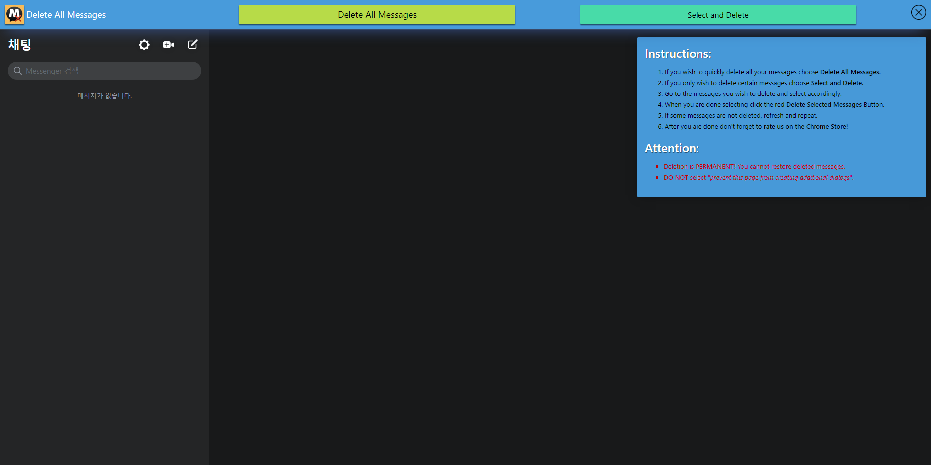 확장프로그램의 특징상 언제 프로그램이 삭제될 지 모릅니다. 글을 쓴 기준으로 정상작동 하였으며, 확장프로그램을 설치하고 쉽게 메세지를 삭제할 수 있습니다. 사용방법은 매우 간단합니다.