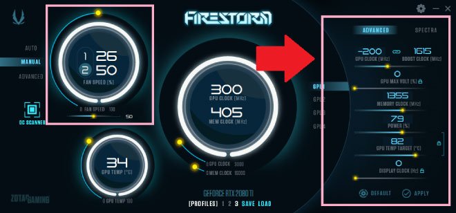 그래픽 카드의 경우에는 자신의 그래픽 카드를 살펴보고 하드웨어의 LED를 직접 제어할 수 있는지, 아니면 별도의 프로그램을 제공하는지 살펴봐야 한다. 나의 그래픽 카드의 경우에는 NVIDIA GeForce RTX 2070 SUPER를 사용하고 있고 제조사는 ZOTAC International Ltd.이다. 따라서, ZOTAC 사이트에서 다운로드할 수 있는 파이어스톰(FireStorm)을 통해 FAN 속도와 오버클럭뿐만 아니라 LED도 제어할 수 있었다.