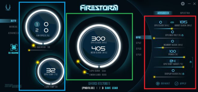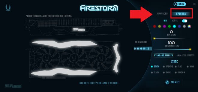 그래픽 카드의 경우에는 자신의 그래픽 카드를 살펴보고 하드웨어의 LED를 직접 제어할 수 있는지, 아니면 별도의 프로그램을 제공하는지 살펴봐야 한다. 나의 그래픽 카드의 경우에는 NVIDIA GeForce RTX 2070 SUPER를 사용하고 있고 제조사는 ZOTAC International Ltd.이다. 따라서, ZOTAC 사이트에서 다운로드할 수 있는 파이어스톰(FireStorm)을 통해 FAN 속도와 오버클럭뿐만 아니라 LED도 제어할 수 있었다.