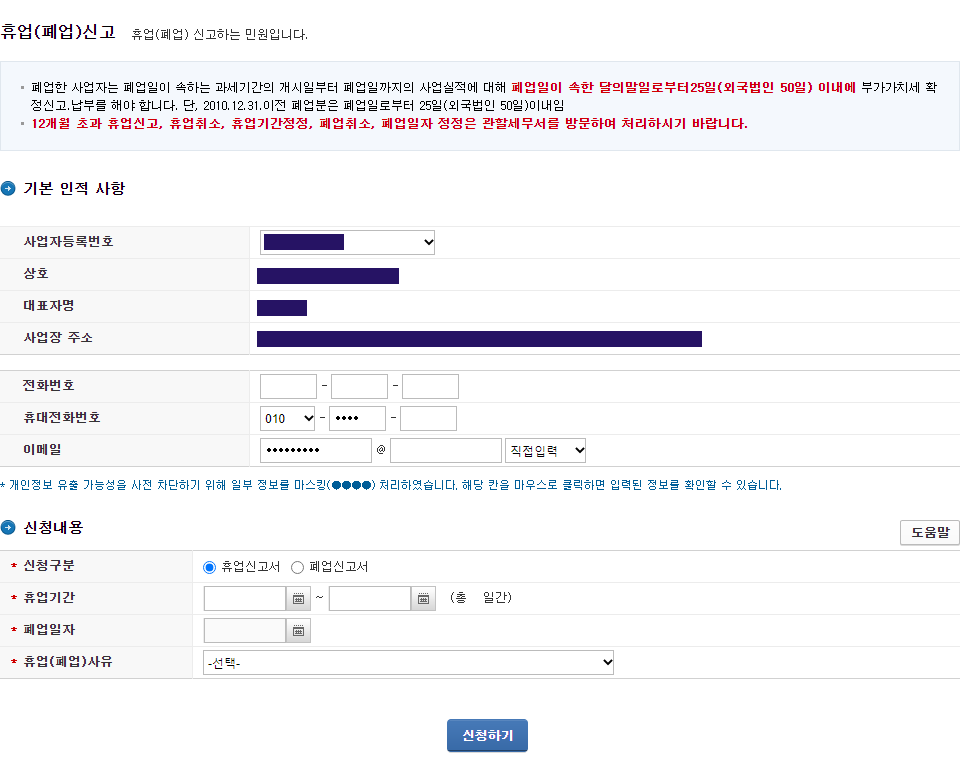 3. 휴(폐업)신고 민원 페이지를 작성하고 신청하기를 누릅니다.