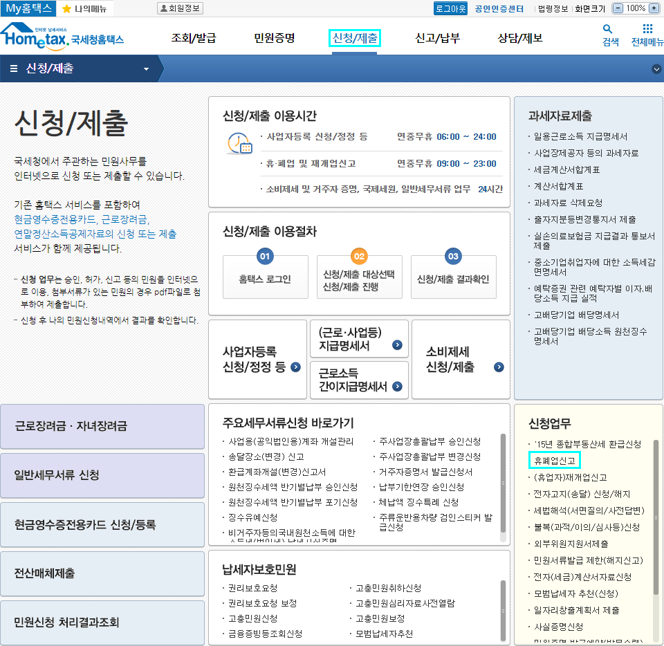 2. 우측 하단에 있는 신청업무의 휴폐업신고를 클릭합니다.