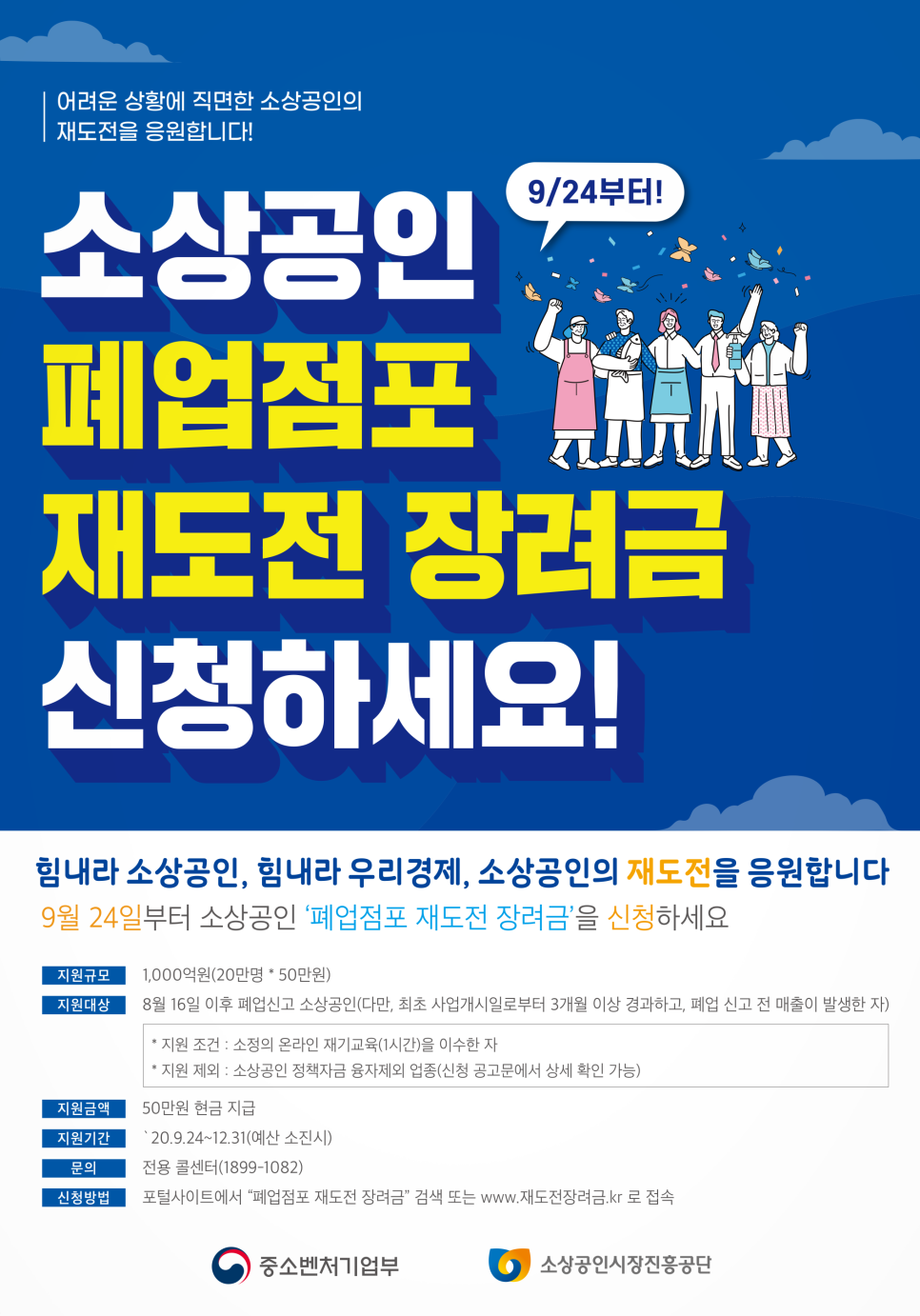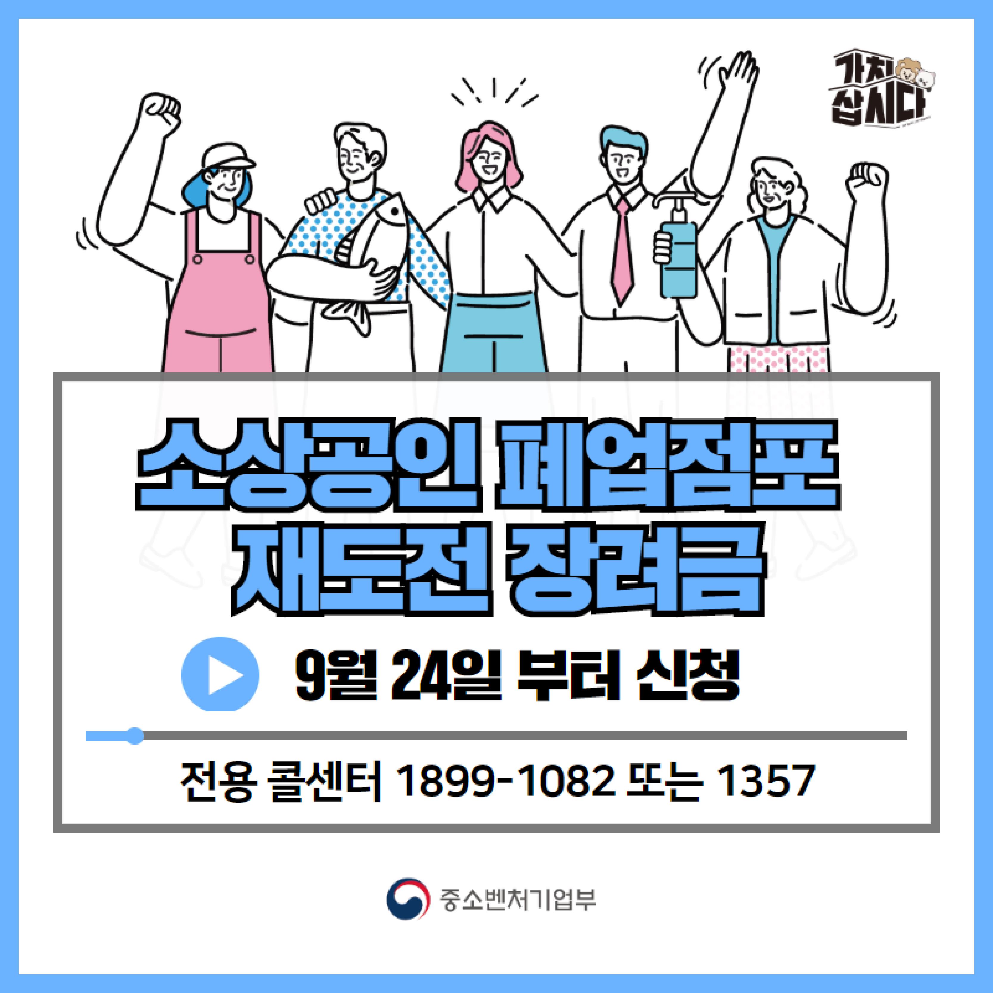 폐업점포 재도전 장려금 콜센터는 1899-1082로 유선상담이 가능합니다. 이 페이지는 소상공인시장진흥공단이 관리 및 운영합니다.