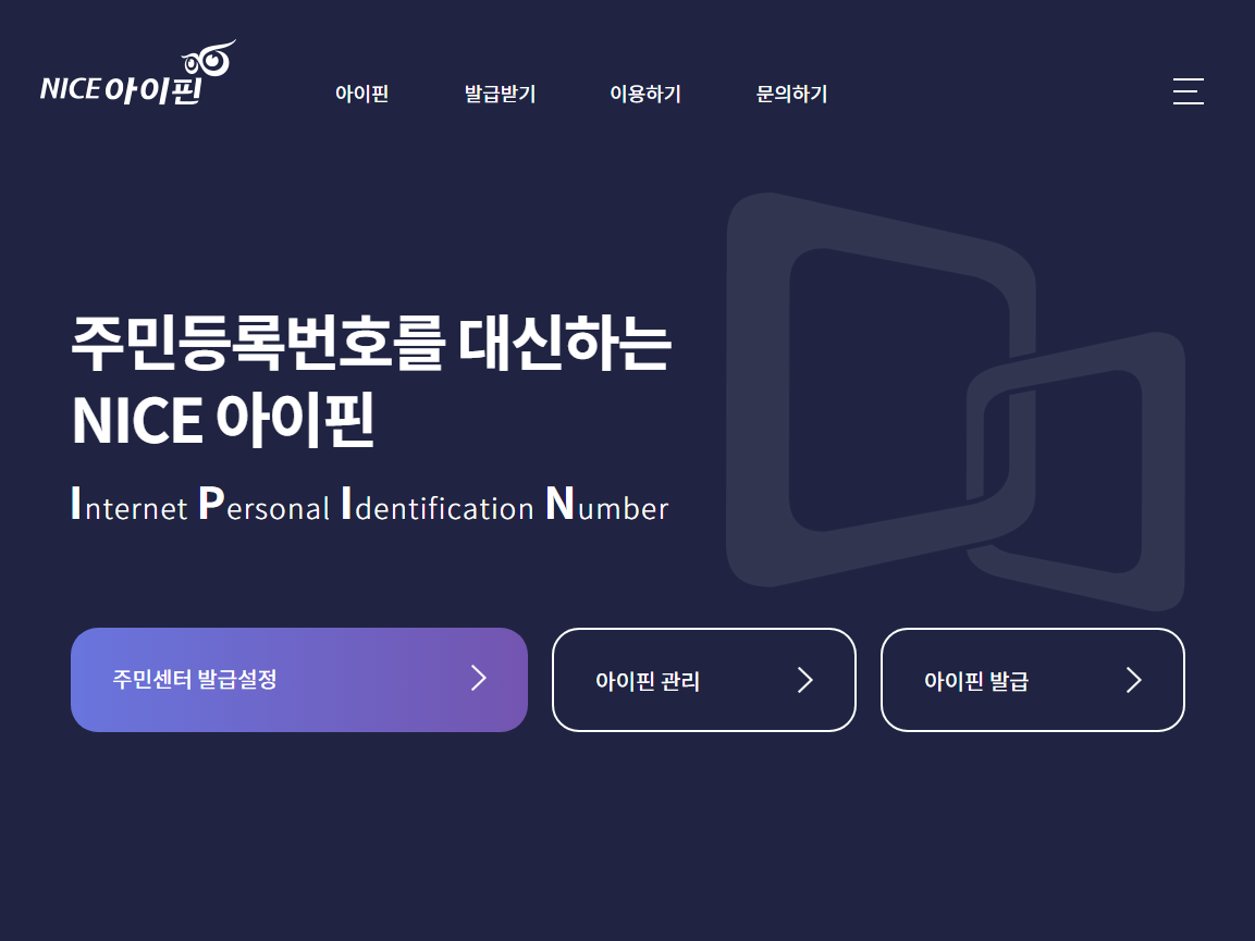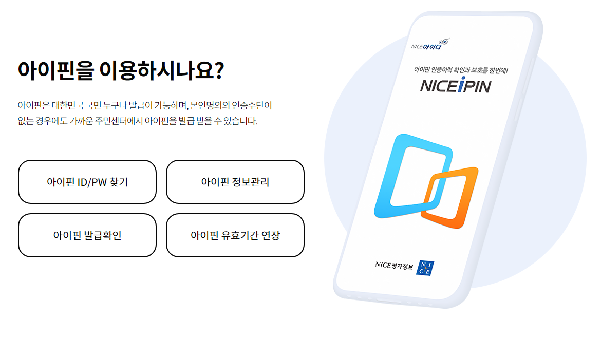 NICE 아이핀 발급사이트에서 쉽게 발급받을 수 있으며, 주민센터 발급설정 또는 아이핀 발급을 통해 발급을 받을 수 있습니다. 인터넷에서 바로 발급받아 사용하는 것은 아이핀 발급을 선택하시길 바랍니다.