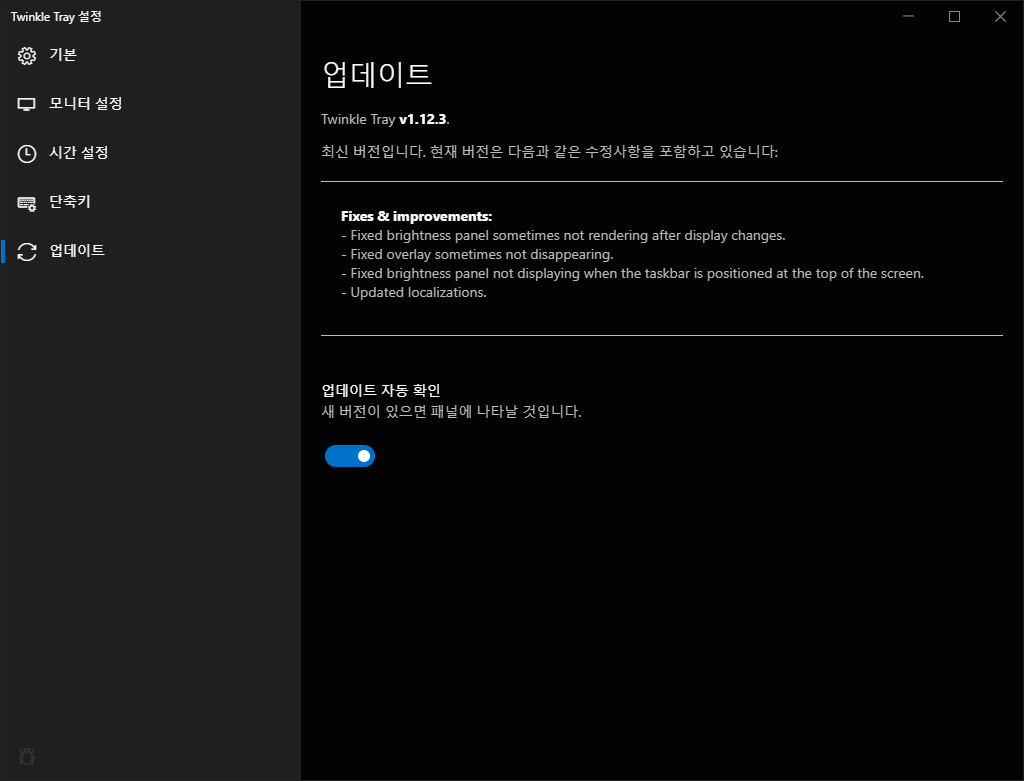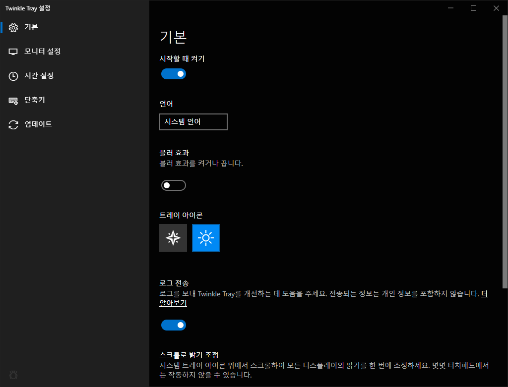 - 로그 전송(로그를 보내 Twinkel Tray를 개선하는데 도움을 줄 수 있습니다.)