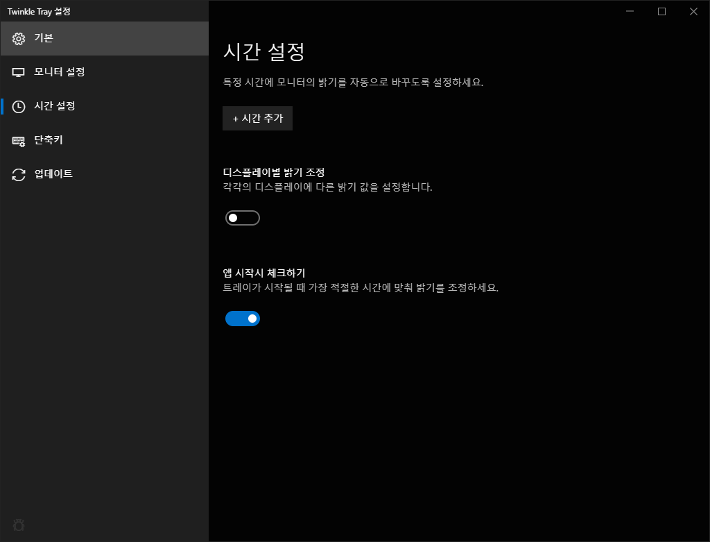 - 앱 시작 시 체크하기(트레이가 시작될 때 가장 적절한 시간에 맞춰 밝기를 조정하세요.)