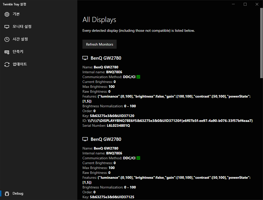 - 디스플레이별 밝기 조정(각각의 디스플레이에 다른 밝기 값을 설정할 수 있습니다.)