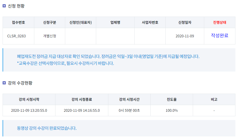 폐업 신청하고 폐업재도전 장려금을 신청하고 11일 이후 확인했더니, 폐업재도전 장려금 지급 대상자로 확인되었다는 안내말을 확인할 수 있었습니다. 정말 아끼던 사업자명이었는데, 여러 이유로 인해서 폐업처리를 하니 조금 아쉽긴 합니다. 사업자번호로 가입했던 계정들도 이제 정리해야 하는 수순인데, 그래도 다행스럽게 폐업재도전 장려금을 확보할 수 있어서 그나마 다행입니다.