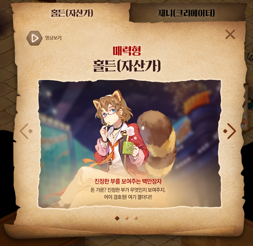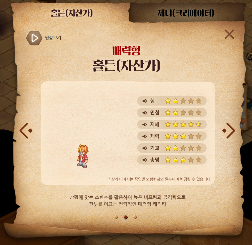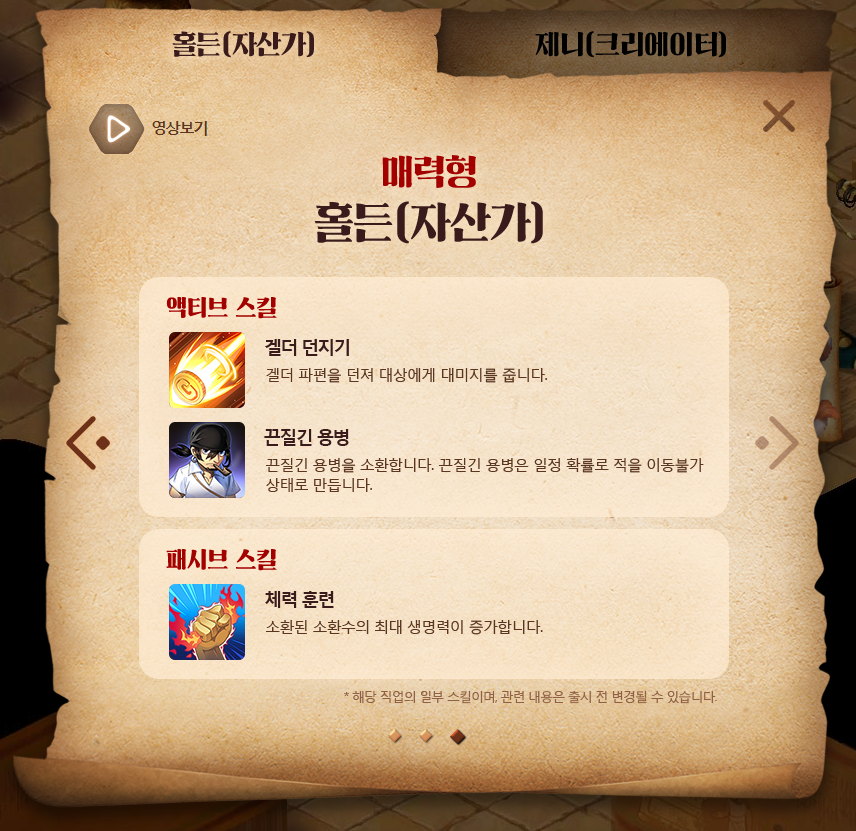 상황에 맞는 소환수를 활용하여 높은 버프량과 공격력으로 전투를 이끄는 전략적인 매력형 캐릭터로 소개되고 있다. 소환수를 부리는 캐릭터인데, 어떻게 보면 렉을 유발하는 캐릭터라고 할 수 있을 것이다. 실제로, 대부분의 게임 내의 소환수들은 그렇게 강하지 않아서 거의 대부분 몸빵으로 쓰이는 경우가 많다. 즉, 딜은 겔더로 해야 하는데, 게임 내에서 홀든(자산가)을 어떻게 육성해야 할지 고민이 많이 될 것 같다.
