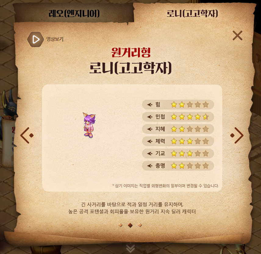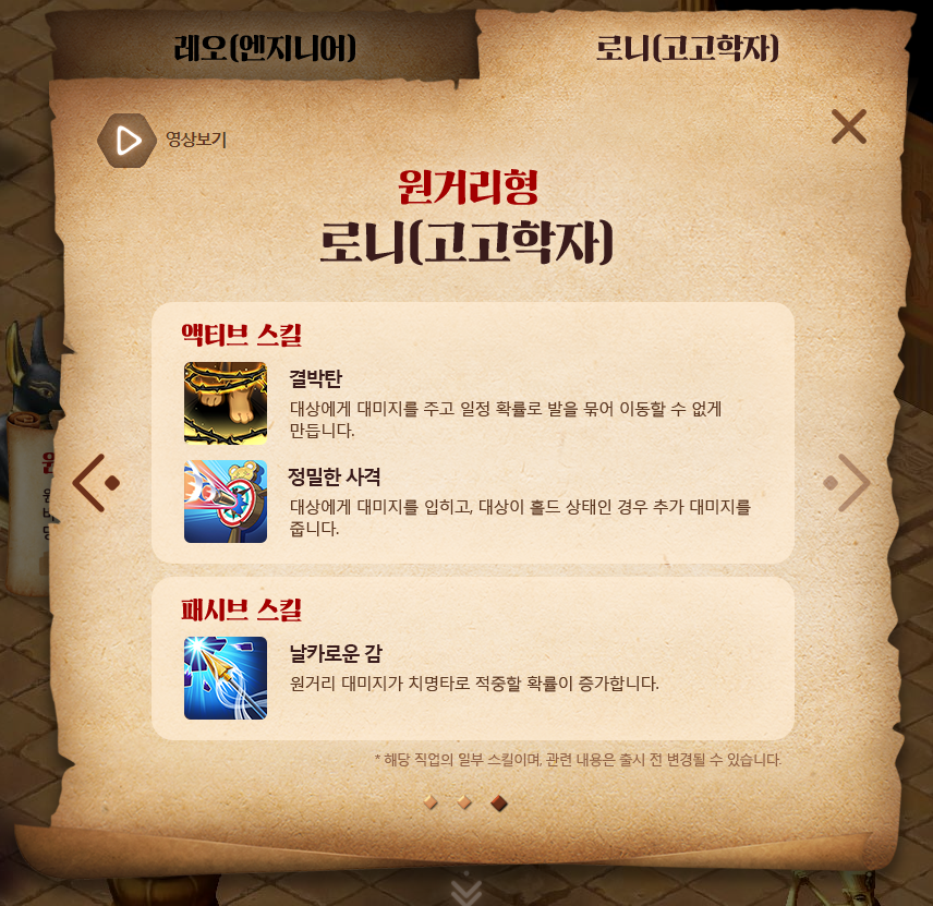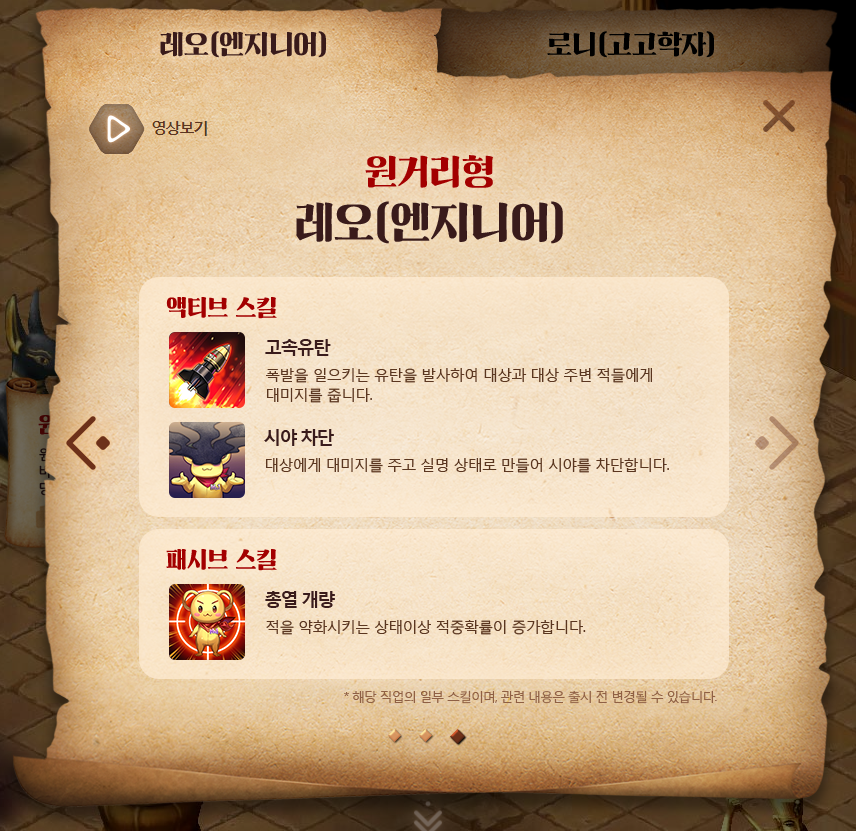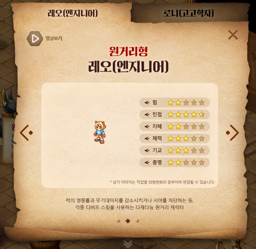 단순히 상태 이상으로 적을 디버프만 하는 것이 아니라, 딜도 되기 때문에 그야말로 다재다능 원거리 캐릭터라고 할 수 있다. 만약 솔플을 즐기는 타입이라면 가장 알맞은 캐릭터가 아닐까 생각이 드는데, 손맛도 있고 딜도 되며 대상 주변에게 대미지를 줄 수 있기 때문에 몰이사냥도 가능할 것으로 예상된다. 또한, 후반부로 갈수록 몬스터를 무력화하는 스킬의 중요도가 높아질 텐데, 아마 레오(엔지니어)가 이 역할을 수행하지 않을까 싶다.