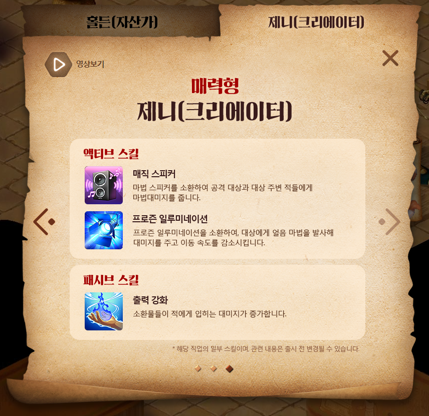 중간중간에 소환물(매직 스피커)을 통해서 대미지를 주고, 이동속도 감소 디버프 스킬이 있는 캐릭터로 대략적인 전투 방식이 예상된다. 먼저 매직 스피커를 깔아 두고 프로즌 일루미네이션으로 얼려서 녹이는 타입일 것이다. 소환물의 경우에는 체력이 없다면 약간 영리하게 게임을 플레이할 수 있을 것이다.
