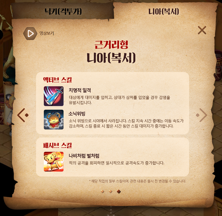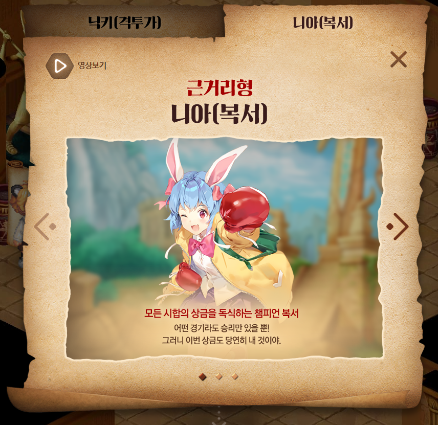 또한 설명을 보면 높은 공격력을 바탕으로 상대의 약점을 파악하여 치명적인 피해를 입히는 근거리 딜러 캐릭터라고 나와있다. 다른 게임으로 비유하면 도적이나 어쌔신 같은 존재일 것이다. 닉키(격투가)가 탱커라면, 니아(복서)는 딜러로 서로 가장 조합이 잘 맞는 캐릭터라고 할 수 있다. 방어와 공격이 전부 되면 무서울 것이 없으니 말이다.