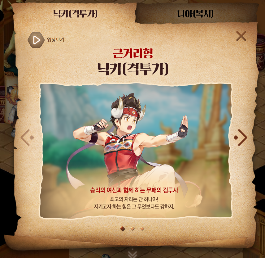 가장 첫 번째로 소개되는 캐릭터로 바로 격투가다. 캐릭터의 스탯을 먼저 보는 것보다 이런 모바일 게임의 경우 스킬의 비중이 매우 높은데, 액티브 스킬과 패시브 스킬을 중점적으로 봐야 할 것이다. 캐릭터 설명을 보면 강력한 체력을 바탕으로 전투에 앞장서서 든든한 방패 역할을 할 수 있는 근거리 탱커 캐릭터라고 설명되어 있다. 즉, 일반적인 게임에서의 탱커라는 것이다. 적 대미지를 모두 몸빵 하고 양 옆의 딜러들이 딜을 넣는 식의 전투 방식일 텐데, 이를 통해 파티플의 중요도를 높일 것으로 예상된다.