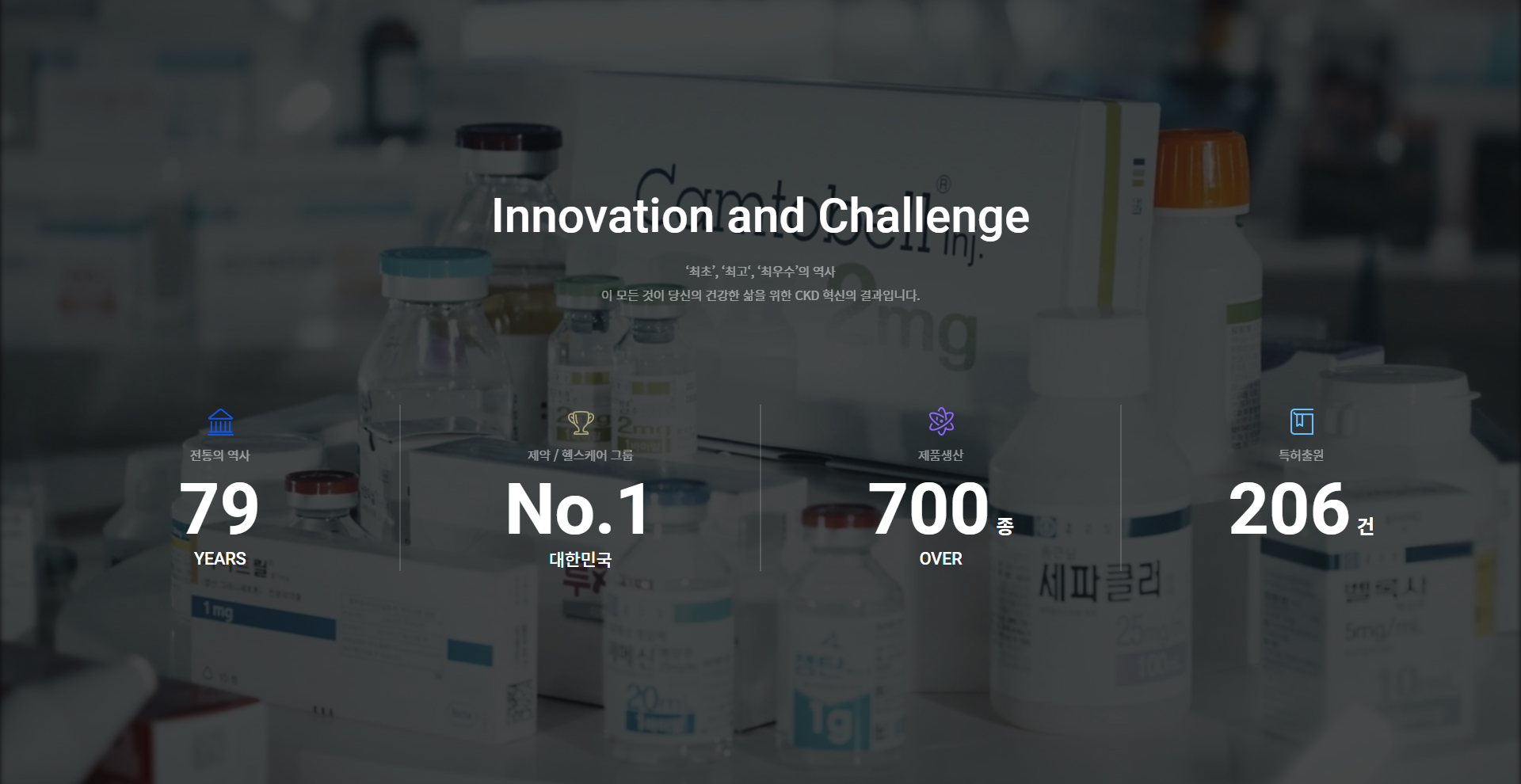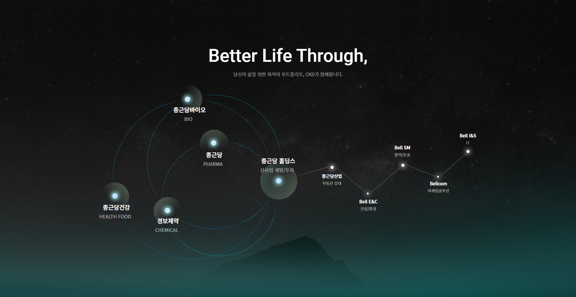 종근당(CKD)의 영문약자로 배경의 그레이톤으로 삽입되었고, 각 종대로 종근당 홀딩스, 종근당, 종근당바이오, 경보제약, 종근당건강에 대한 메뉴로 구성되어 있었다. 직관적인 구성이 인상적이다.