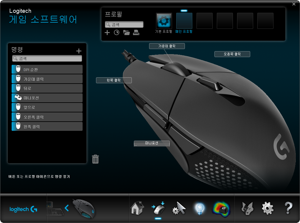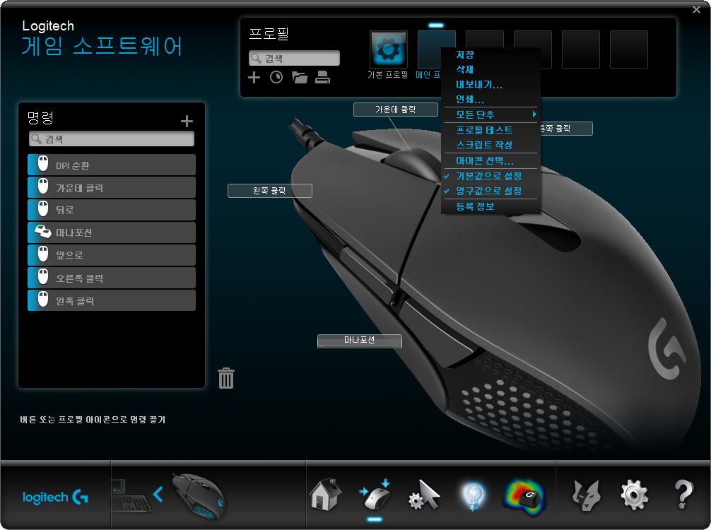로지텍의 게임 소프트웨어에서는 자동 게임 감지로 설정을 변경하고 컴퓨터에 저장된 프로필을 사용해서 스크립트 작성이 가능합니다. 위의 마우스 설정 부분에서 각 버튼에 맞게 명령키나 멀티 키를 지정해서 간단한 매크로 기능을 구현할 수 있습니다.