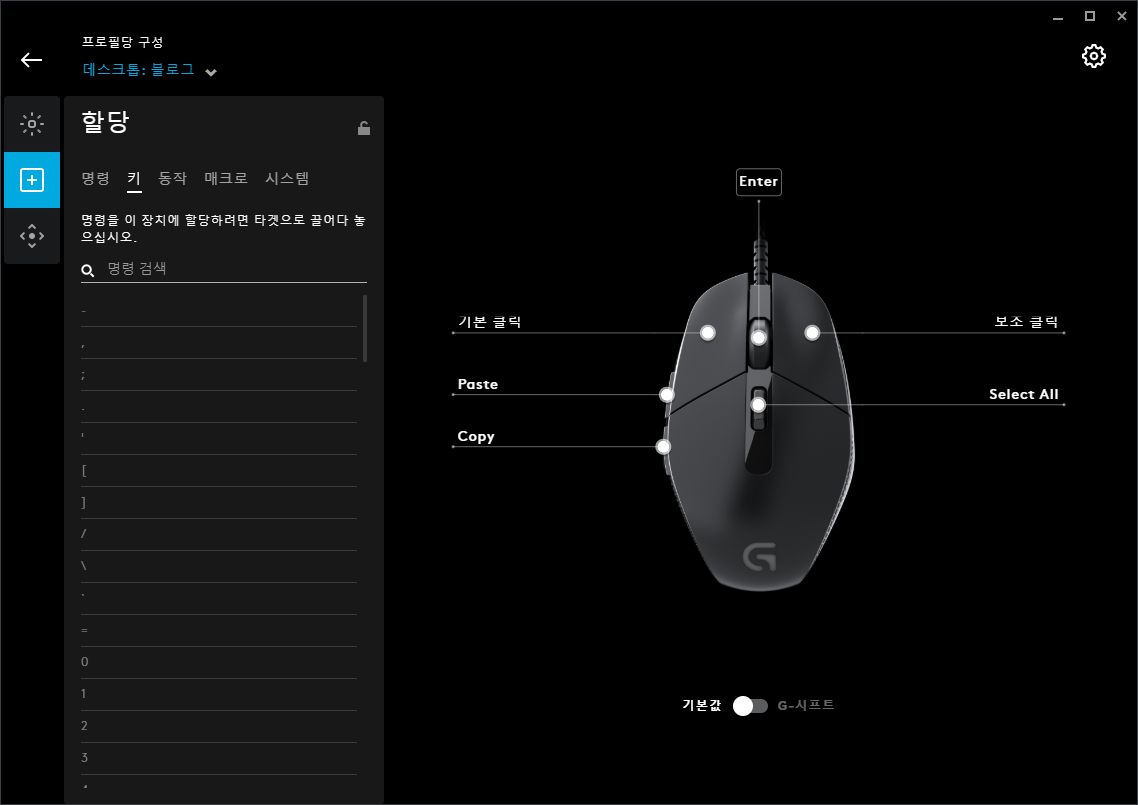 게임 뿐만 아니라 웹서핑을 하더라도 자주 사용하는 복사, 붙여넣기 기능을 왼쪽 마우스 버튼에 세팅해서 사용하기에도 용이합니다. G-시프트를 통해서 할당된 키를 쉽게 변경할 수 있으며, 프로필 당 구성을 통해 해당 엡에서만 적용되는 매크로 및 명령키를 작동시킬 수 있습니다.