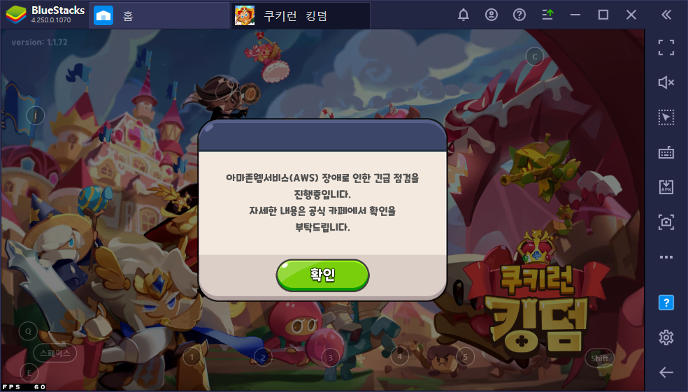 아니, 이런! 쿠키런 : 킹덤이 아마존웹서비스(AWS) 장애로 인해서 오랫동안 긴급 점검을 하고 있었다. 아마, 계정은 만들어놔서 긴급 점검 보상을 받고 시작할 수 있을 것 같다. 아직, 본격적으로 게임을 즐기지 못하고 있기 때문에 서버가 오픈되면 쿠키런 : 킹덤을 제대로 즐겨봐야겠다.