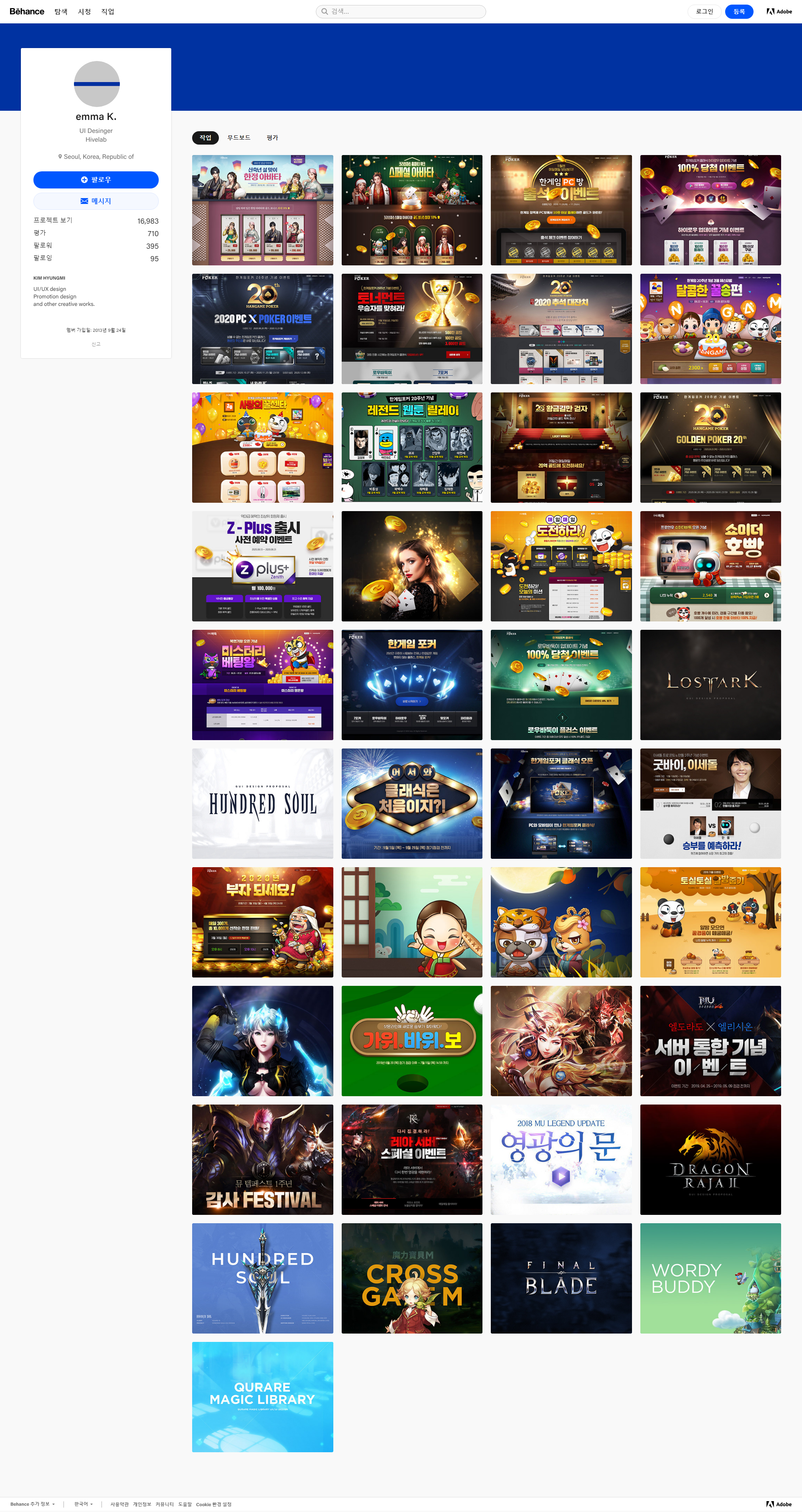 주로 게임 일러스트나 삽화, 랜딩페이지, 이벤트 페이지 등의 작업물들이 있는데, 굉장히 스타일리쉬하고 화려하다. 그래서 딱 보면 한 눈에 가는 것이 장점이다. 디자인 실력이 상당하다.