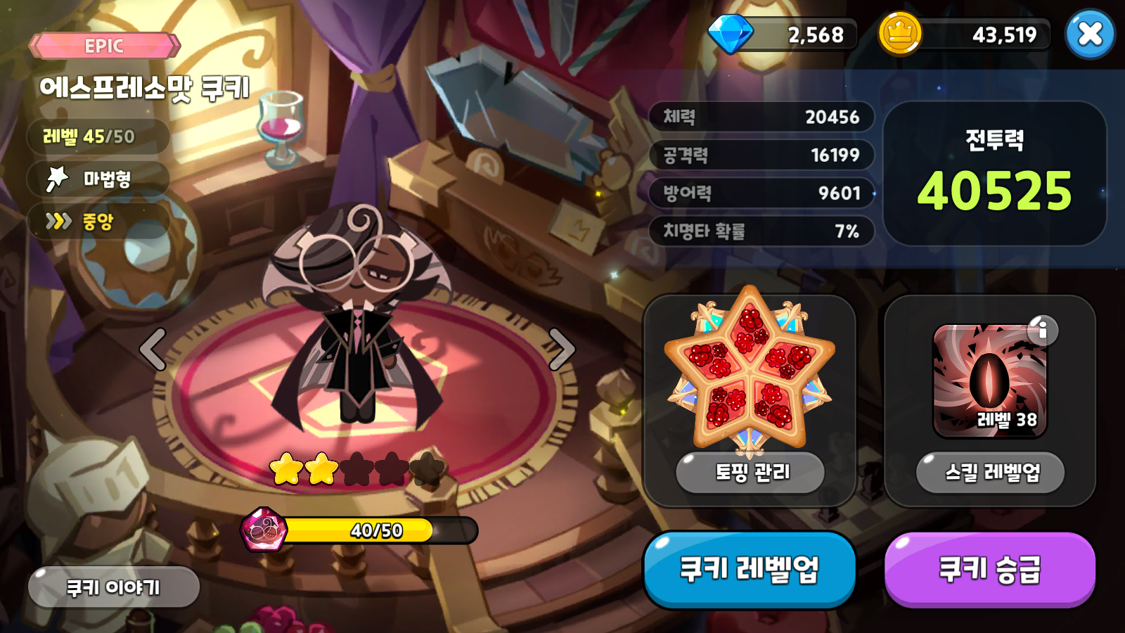 에스프레소맛 쿠키는 고급 화끈화끈 라즈베리로 풀토핑하면 된다. 추가 옵션 중 공격력이 나오지 않을 수 있기 때문에 최대한 고급 라즈베리 토핑을 확보하고 강화해서 공격력을 확보해주는 것이 좋다.