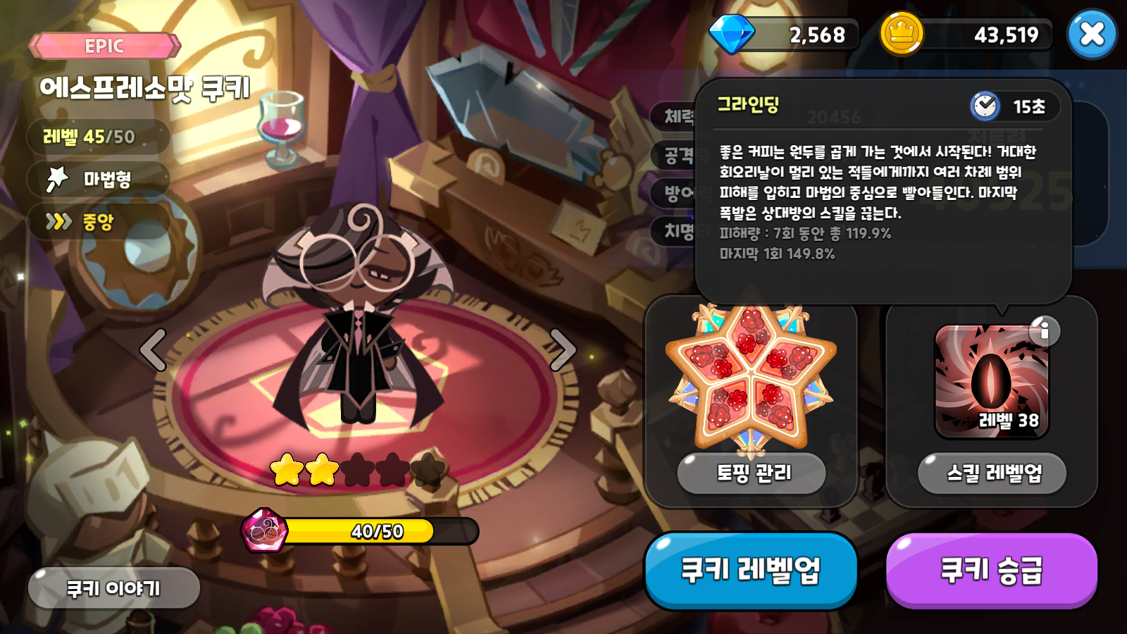 에스프레소맛 쿠키를 최고로 올려준 스킬, 명실상부 어디에서나 꼭 사용되는 에스프레소맛 쿠키의 스킬은 그라인딩이라는 폭딜 스킬이다. 스킬을 사용하면 7회동안 총 119.9%에 달하는 데미지를 주고, 마지막 1회는 149.8%의 무지막지한 데미지를 준다.