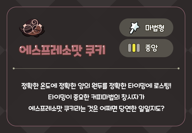 정확한 온도에 정확한 양의 원두를 정확한 타이밍에 로스팅! 모든 것이 계획대로 딱딱 맞아떨어져야 직성이 풀린다는 에스프레소맛 쿠키. 언제나 바쁘게 시간에 맞춰 동분서주하니 왕국에 커피향이 마를 날이 없다! 타이밍이 중요한 커피마법의 창시자가 에스프레소맛 쿠키라는 것은 어쩌면 당연한 일일지도? 어딘가 탄 것 같은 수상한 냄새를 폴폴 풍겨 종종 흑마법사라 오해를 받고는 하지만... 딱히 해명할 생각은 없어보인다. 잠도 자지 않는지 밤마다 커피콩을 갈며 새로운 마법을 연구하는 모습을 쉽게 볼 수 있는데, 덕분에 일각에서는 커피를 너무 많이 마시는 게 아니냐는 걱정이 속출하고 있다.