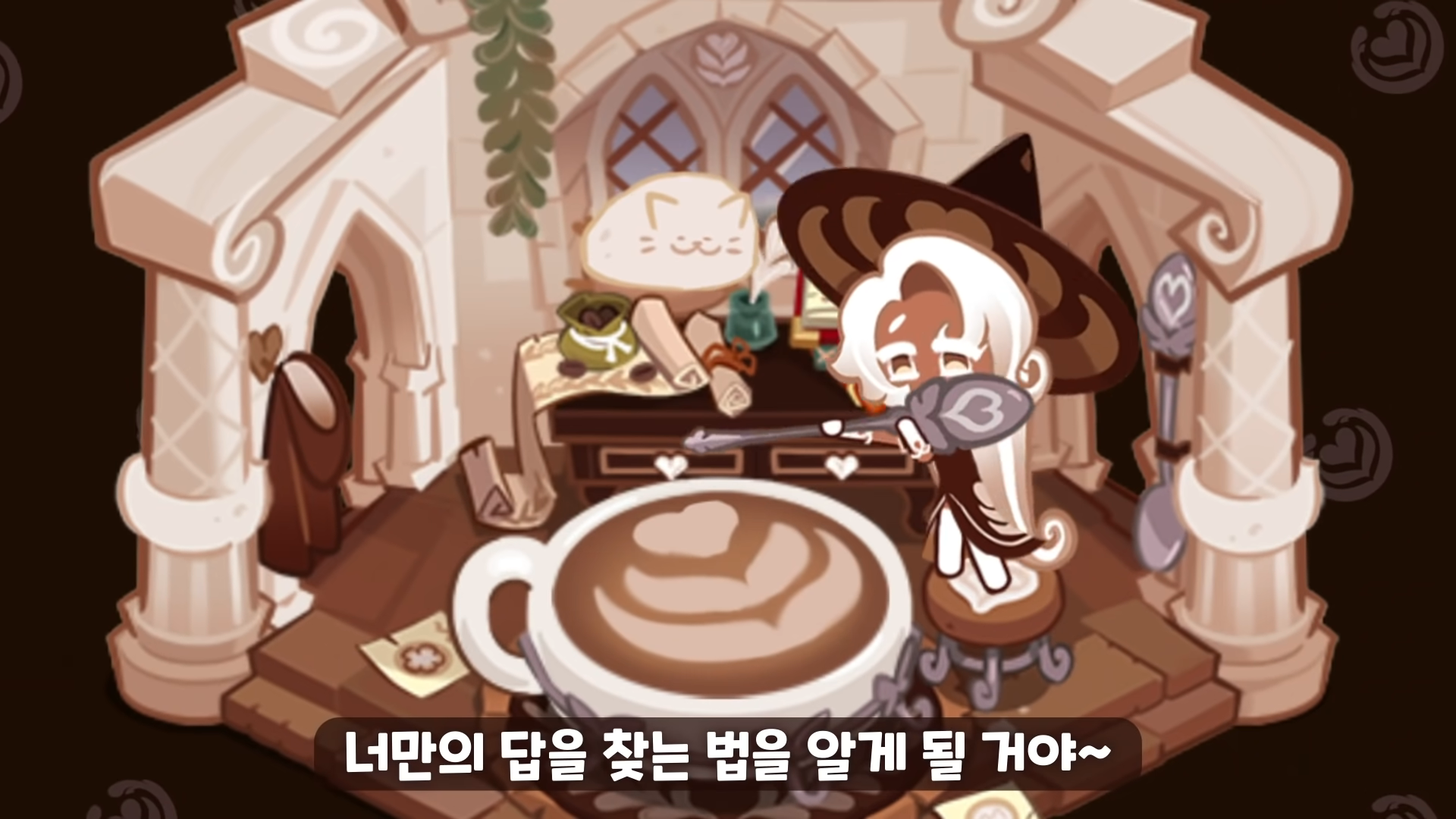커피냐 우유냐 고민된다면 둘 다 마시면 되지~ 쓰디쓴 커피와 달콤한 우유가 섞여 걱정도 녹일만큼 깊고 부드러워진 쿠키. 에칭 스태프를 요리조리 휘둘러 라떼 마법진을 만드는데, 시시각각 변하는 아름다운 문양에 넋을 놓고 있다간 마법에 걸려들지도 모른다! 어느 깐깐한 마법사와 함께 커피마법을 연구한 공로를 인정받아 마법 학교 선생님이 되었다는데... 종소리보다 늦게 도착하는 건 십중팔구 라떼 한 잔의 여유를 즐기고 있기 때문! 믿음직한 선생님이 되기엔 갈 길이 멀지만, 서툴러도 중요한 건 자신감이라며 미소지으니 누군가에게 이미 최고의 선생님일지도?