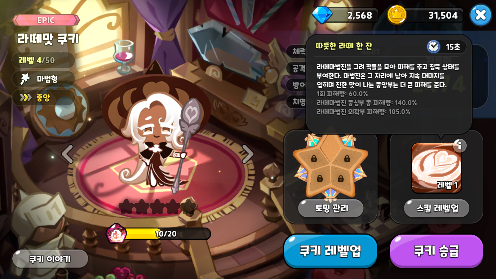 토핑은 쿨감 토핑(고급 째깍째깍 초콜릿칩)과 공격력 토핑(고급 화끈화끈 라즈베리)중에서 많은 고민을 할텐데, 지금은 일반적으로 공격력 토핑이 더 좋다고 한다. 아직 쿠키 승급도 해야하고, 토핑작도 해야하고 레벨도 올려야 해서 더 연구가 필요할 듯 하다.