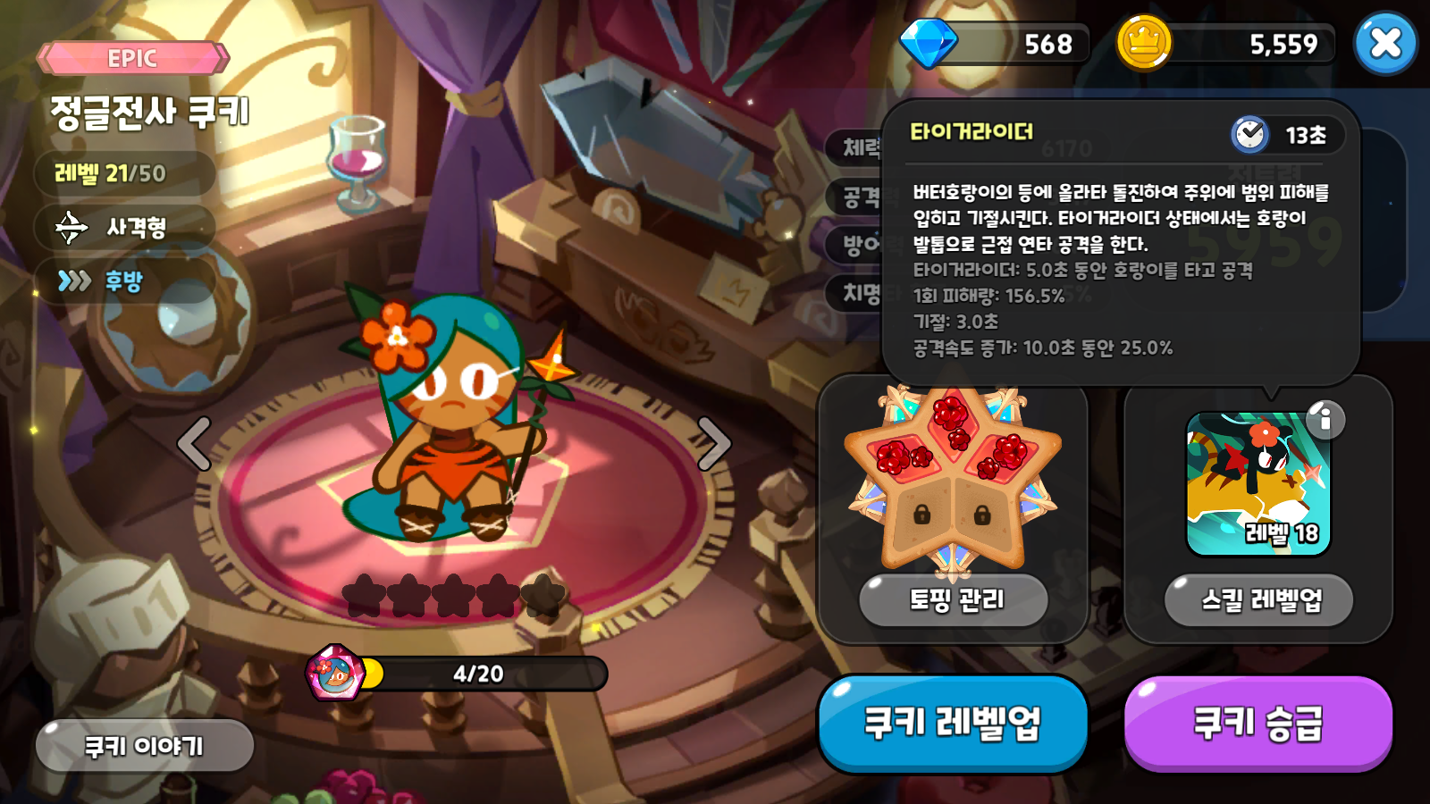토핑의 경우에는 쿨감이나 공격력 토핑을 사용하는데, 만약 길드 토벌이나 보스전 용도로 활용할 때는 쿨감 토핑을 쓰는 것이 더 좋을 것 같다. 타이거호랑이 스킬 쿨타임은 13초로 다른 쿠키들의 쿨타임보단 적다.