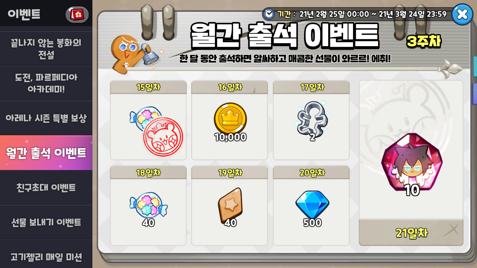 월간 출석 이벤트가 시작되고 뒤늦게 쿠키런:킹덤을 시작했다. 오늘까지 정확히 15일차 플레이 중이고, 매일매일 했던 것은 아니고 도중에 잠깐 안했던 적도 있었다. 무엇보다 무과금유저이며, 한번도 결제하지 않았다. 2주차 후기는 무과금으로 어디까지 플레이가 가능할지, 어떻게 재밌게 즐길 수 있을지 쿠키런 킹덤을 시작하고자 하는 사람들에게 도움이 되는 정보라고 생각된다.