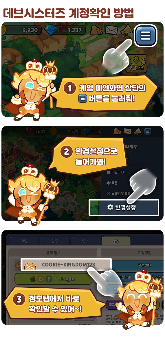 쿠키런:킹덤 쿠폰 입력 사이트에 들어가서 쿠폰 번호를 입력하세요. DevPlay 계정은 아래의 데브시스터즈 계정확인 방법을 확인 후 입력해주시면 됩니다.