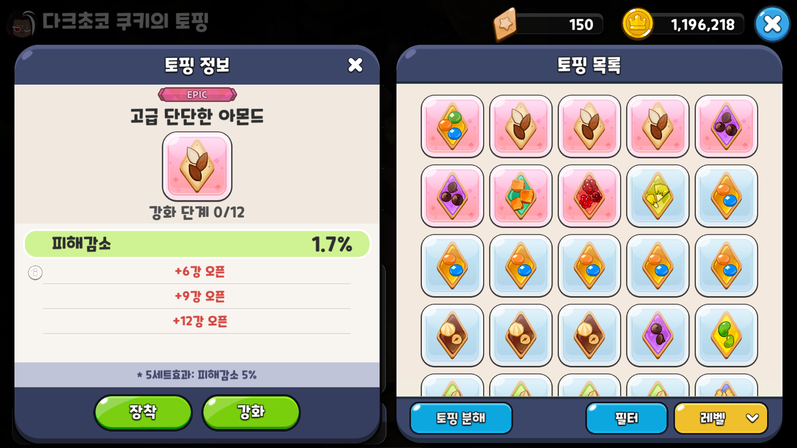 다크초코 쿠키 뿐만 아니라, 방어형 쿠키, 돌격형 쿠키의 경우 대두분 고급 단단한 아몬드(피해감소) 토핑을 선호하고 있습니다. 기존에는 방어력을 올려주는 딱딱한 호두를 많이 사용했는데, 피해감소 효율이 더 좋다는 이야기가 퍼지면서 아몬드 토핑을 하는 사람들이 많습니다.