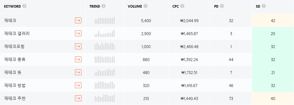 위의 키워드 분석 도구 중에서 해외 우버서제스트를 가장 추천한다. 위의 PD(Paid Difficulty)와 SD(SEO Difficulty)가 높을수록 경쟁이 심한 것을 의미한다. 따라서, 위의 재테크 관련 키워드 중에서 그나마 괜찮은 키워드를 찾은다면 '재테크 갤러리'나 '재테크 포럼'과 같은 키워드를 공략하는 것이 유의미한 결과를 낳을 것이다.