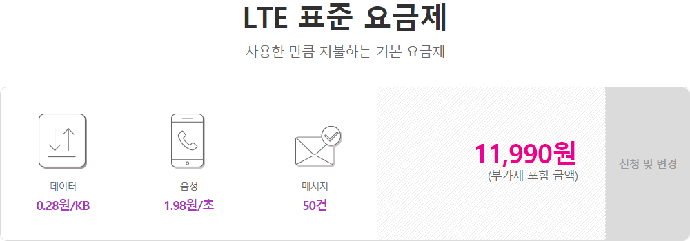 문자 50건 무료, 데이터 KB당 0.28원(MB당 286.72원) - 문자 요율: SMS 1건 22원, MMS 1건 44원,